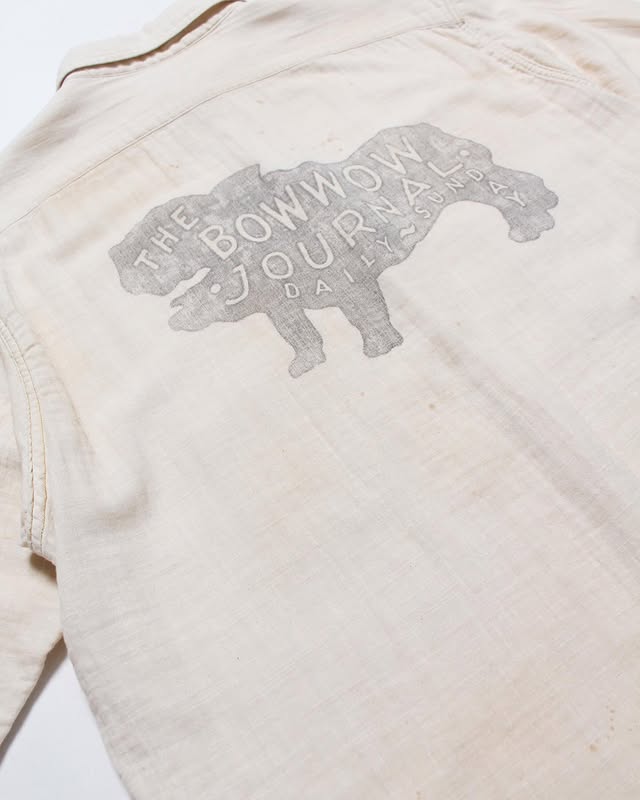 1930年代以前のワーキングウエアの文脈を背景に、「THE BOW WOW JOURNAL」の企業アイコンを配したガーゼシャツ。