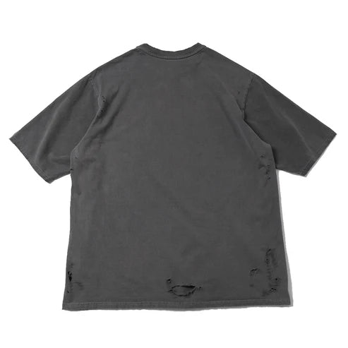 レギュラーサイズの肩幅に、ゆとりのある身幅で形成したビッグシルエットTシャツです。黒の顔料染めを施した後、バイオソーピングすることで色を落とし、さらに手作業でダメージを加えています。
