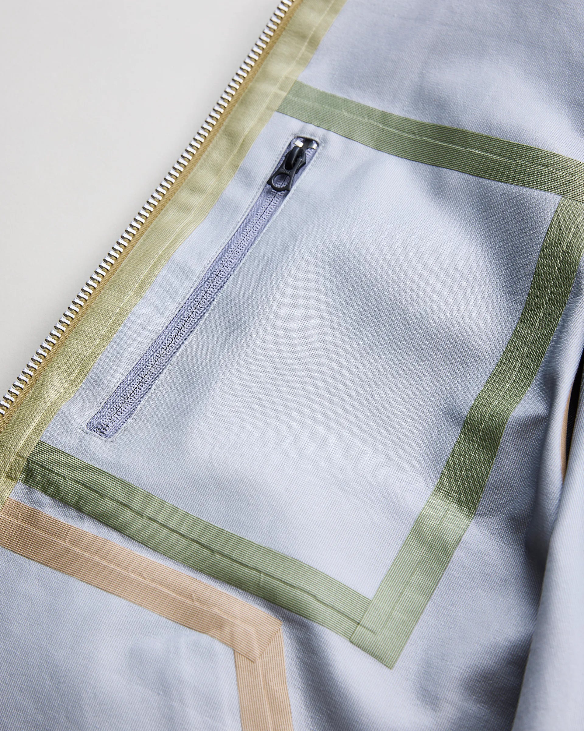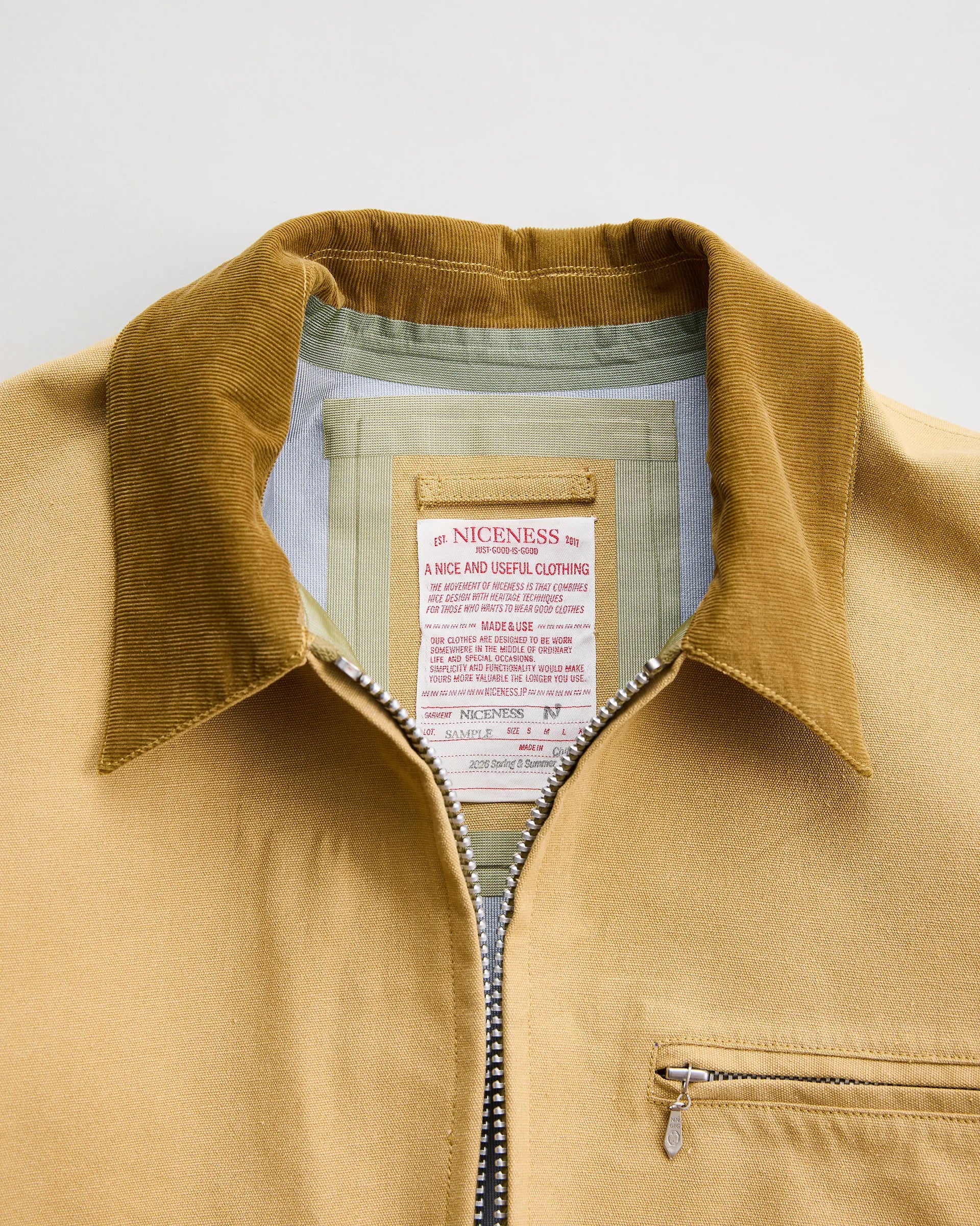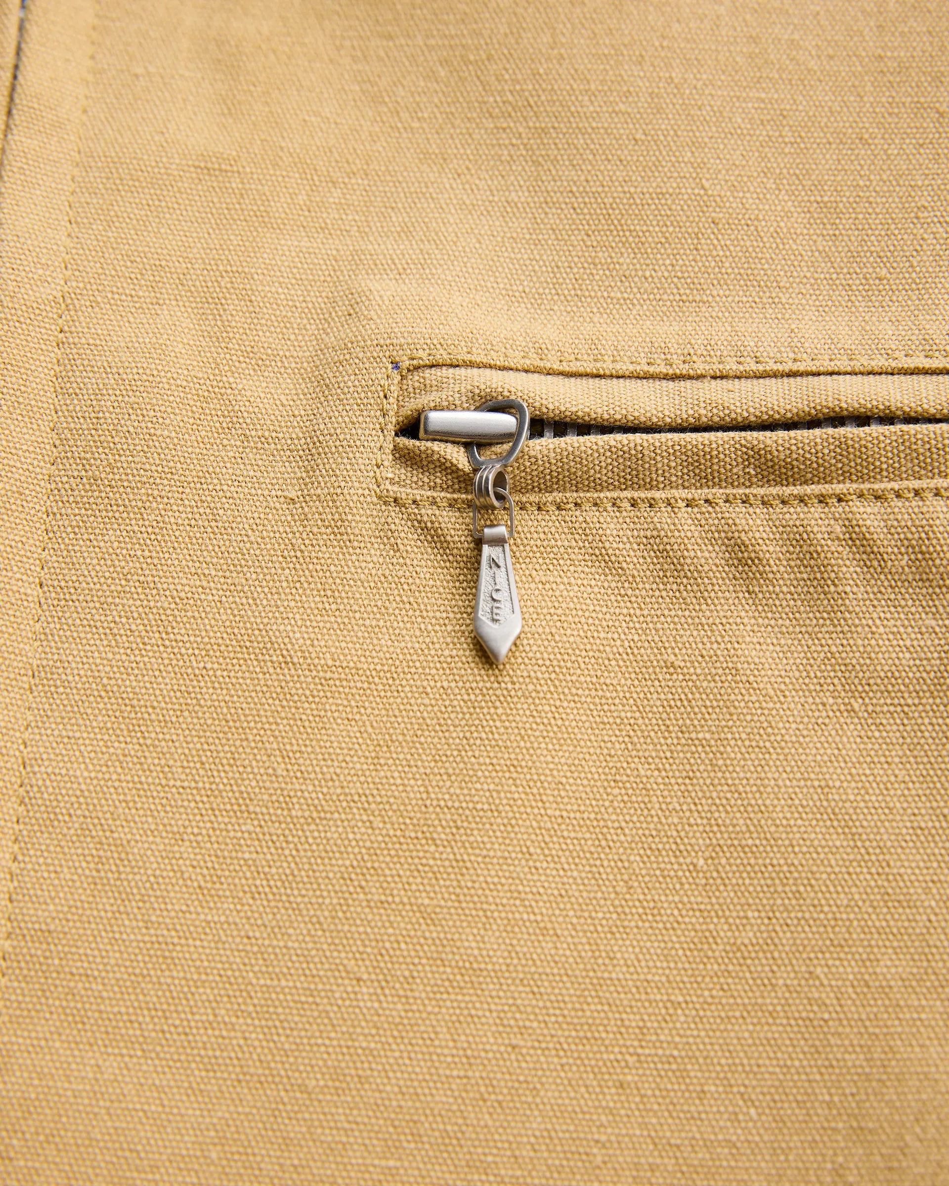硫化染めで仕上げたコットンダック、中間層に熱可塑性ポリウレタン、裏面にナイロン100%の3層構造生地で製作した3レイヤーワークジャケット。1970年代のワークウェアに見られる重厚な佇まいをリファレンスとしながら、素材と設計のアプローチを一新したショート丈モデル。表地には特殊な揉みほぐし加工を施し時間を経たような風合いを再現し、防水加工と撥水性を加えることでクラシックな外観とは裏腹に現代的な機能性を備えた素材へと昇華。軽量ながら防風・防水性能と通気性を兼ね備え、重厚感のある表情と先進的な素材が生むギャップが存在感を放つ一着。