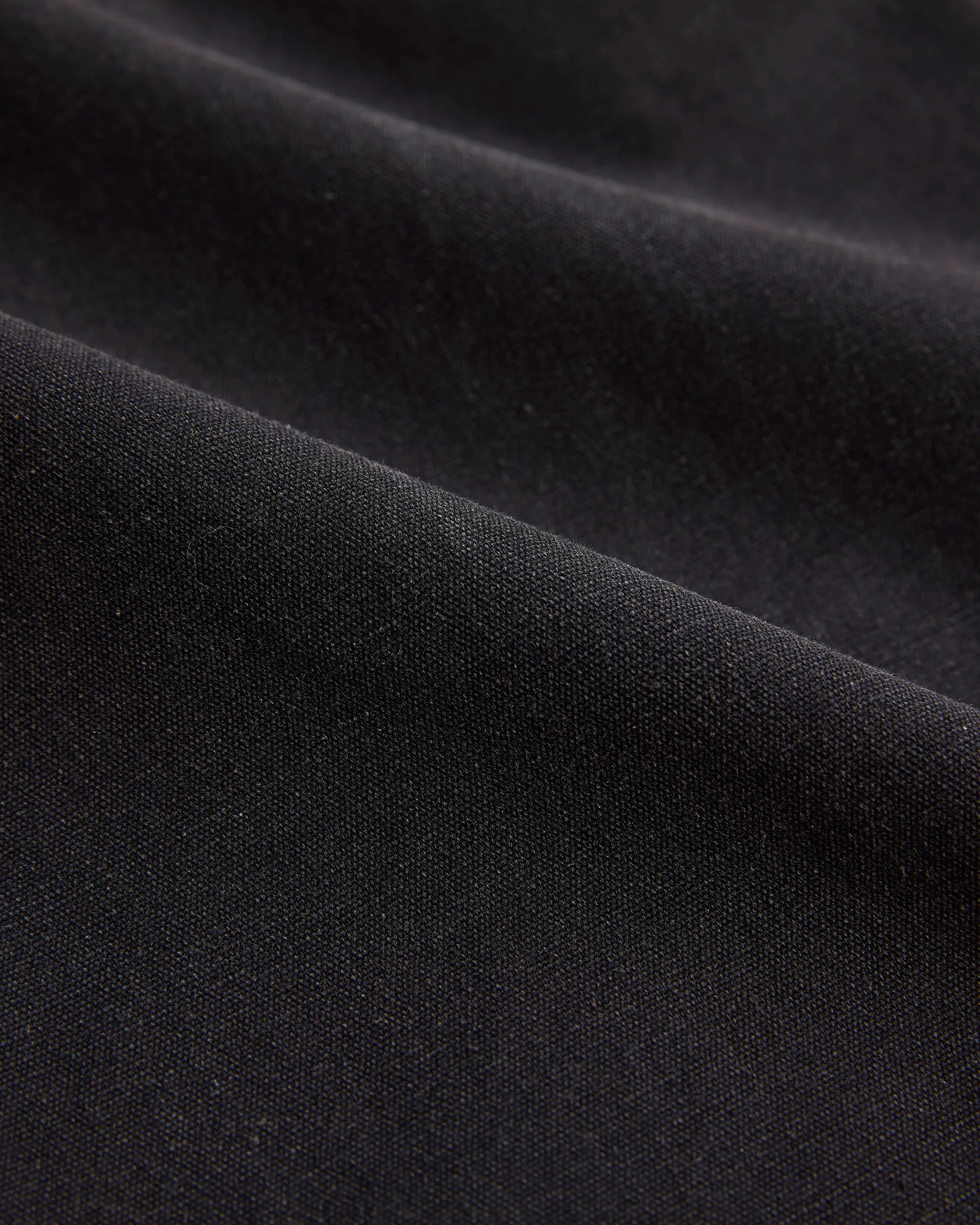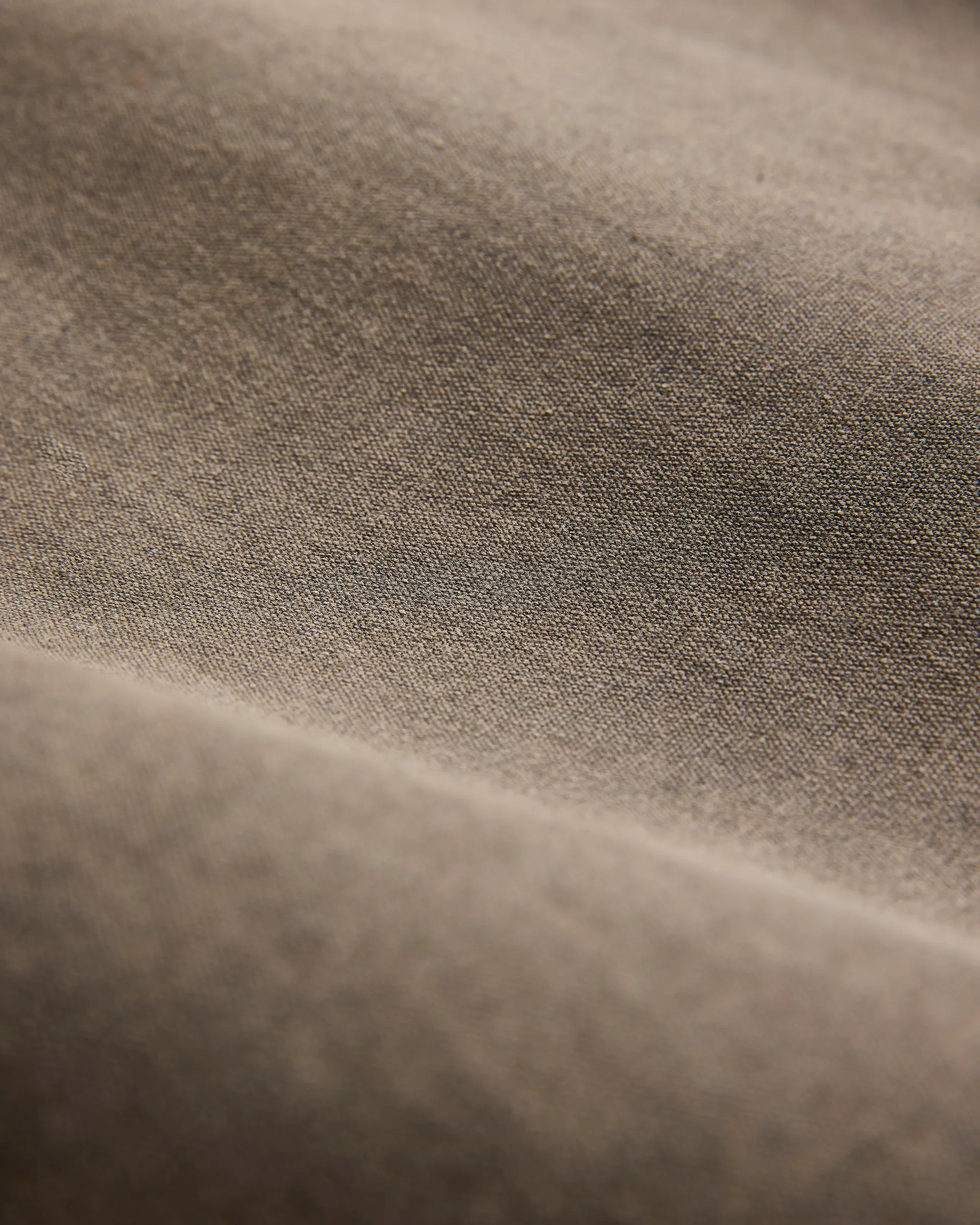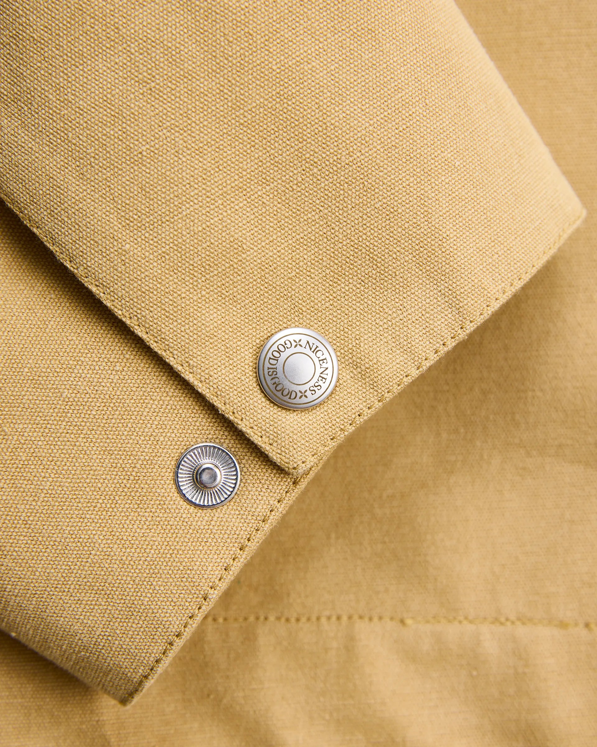 硫化染めで仕上げたコットンダック、中間層に熱可塑性ポリウレタン、裏面にナイロン100%の3層構造生地で製作した3レイヤーワークジャケット。1970年代のワークウェアに見られる重厚な佇まいをリファレンスとしながら、素材と設計のアプローチを一新したショート丈モデル。表地には特殊な揉みほぐし加工を施し時間を経たような風合いを再現し、防水加工と撥水性を加えることでクラシックな外観とは裏腹に現代的な機能性を備えた素材へと昇華。軽量ながら防風・防水性能と通気性を兼ね備え、重厚感のある表情と先進的な素材が生むギャップが存在感を放つ一着。