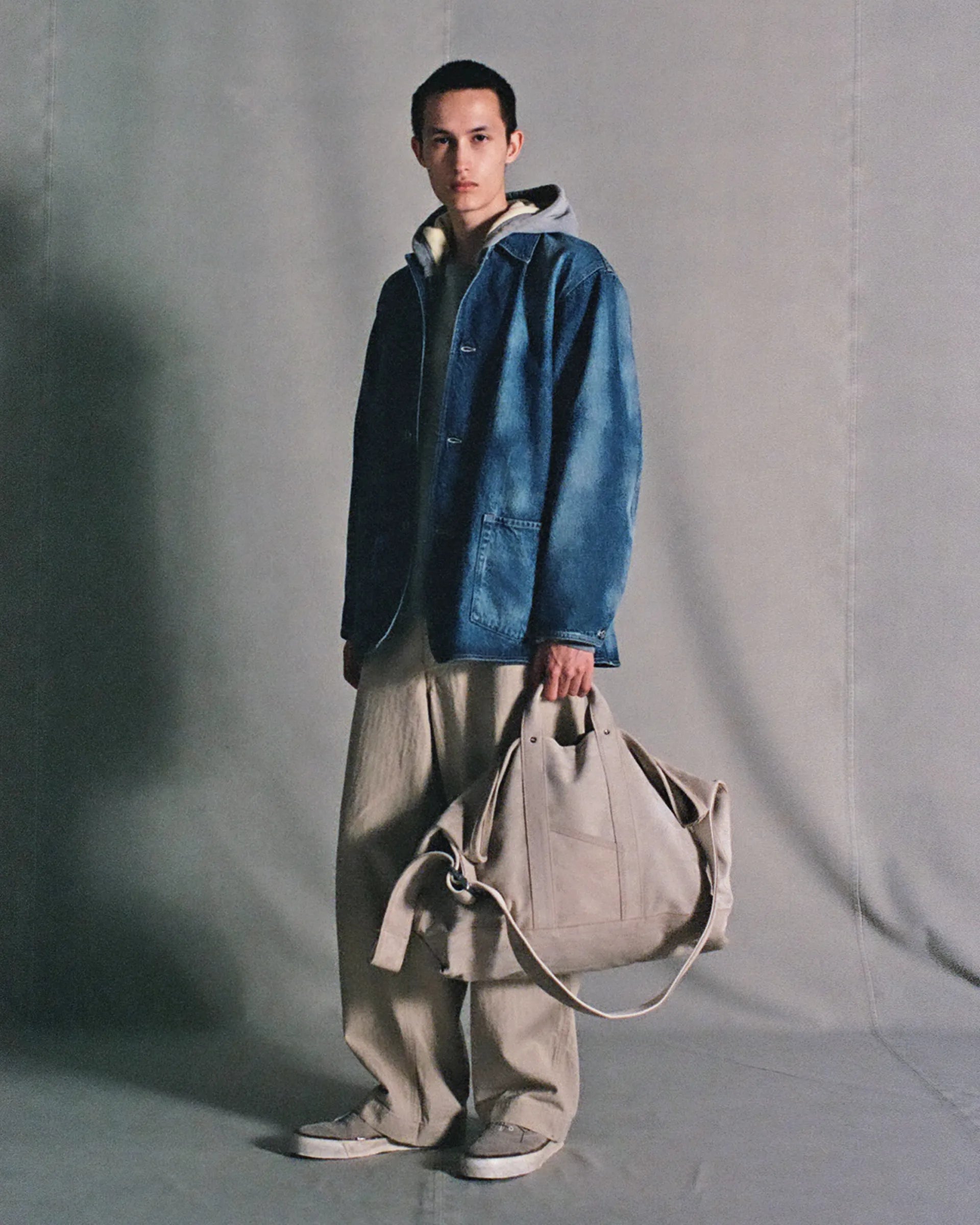 13ozの右綾で織り上げたノンウォッシュ生機デニム生地で製作したカバーオール。シルエットは1940年代のミリタリーカバーオールやヴィンテージジーンズをリファレンスとし、日本の着物に見られる直線的なニュアンスをミックス。生地はロープ染色によるピュアインディゴで芯白に染めた糸を使用し、ナチュラルなムラ糸による自然な毛羽立ちやザラついた風合いを持つ生機ならではの表情を持っています。職人の手作業によるムラ感を表現した製品加工が特徴。褪せやアタリを自然なムードで表現し「育てた表情」を感じられる一着です。