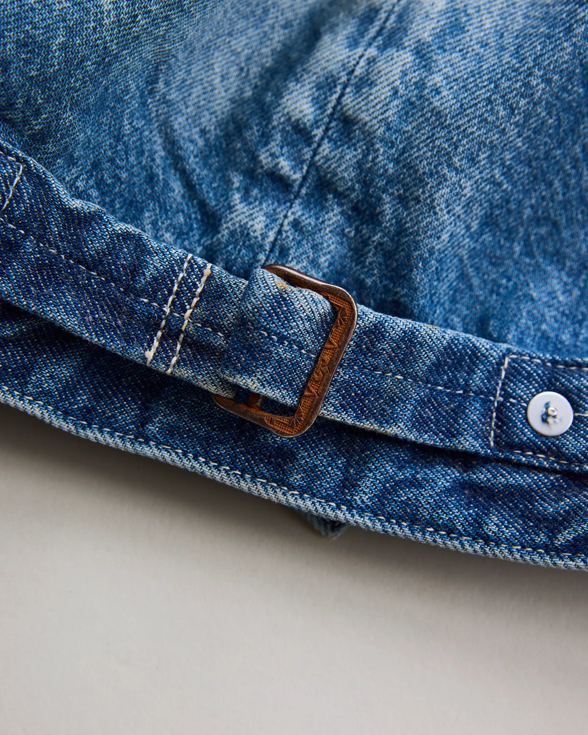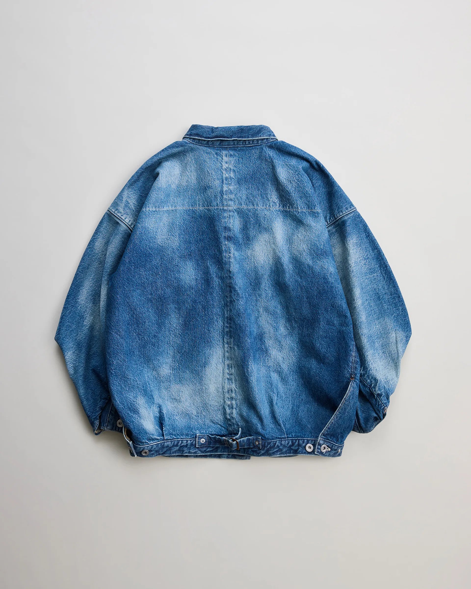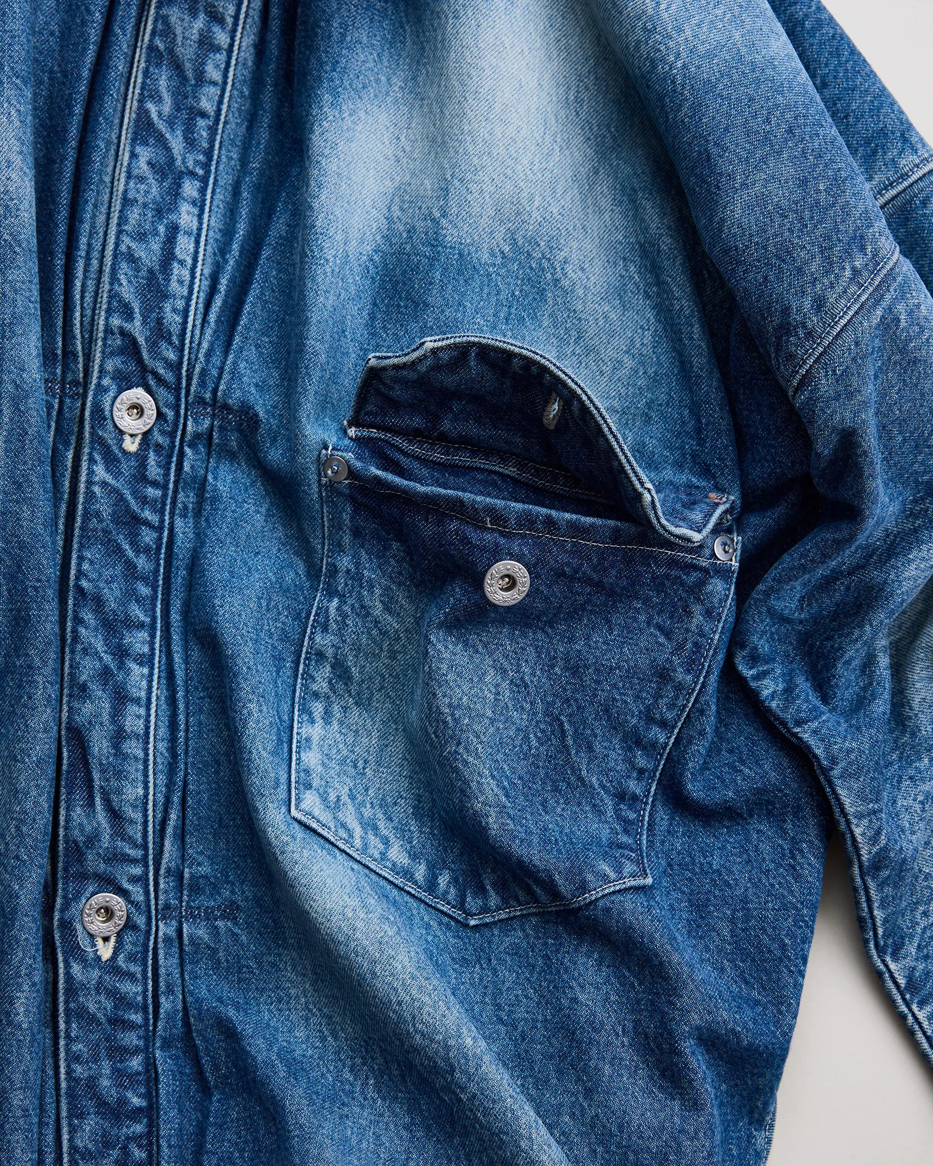 13ozの右綾で織り上げたロープ染色ピュアインディゴの生機デニム生地で製作したトラッカージャケット。1930〜40年代のデニムブルゾンをリファレンスとし、日本の着物に通じる直線的なニュアンスを取り入れ、袖山の丸みを排した独自のシルエットに再構築しています。芯白のムラ糸による豊かな表情と、加工を施していない生機特有の毛羽立ちや硬質な風合いが特長。職人の手作業によるムラ感を表現した製品加工が長年穿き込んだかのようなフェード感とアタリを再現。奥行きのある陰影と風合いが一点ごとに異なる個性を生み出す一着です。