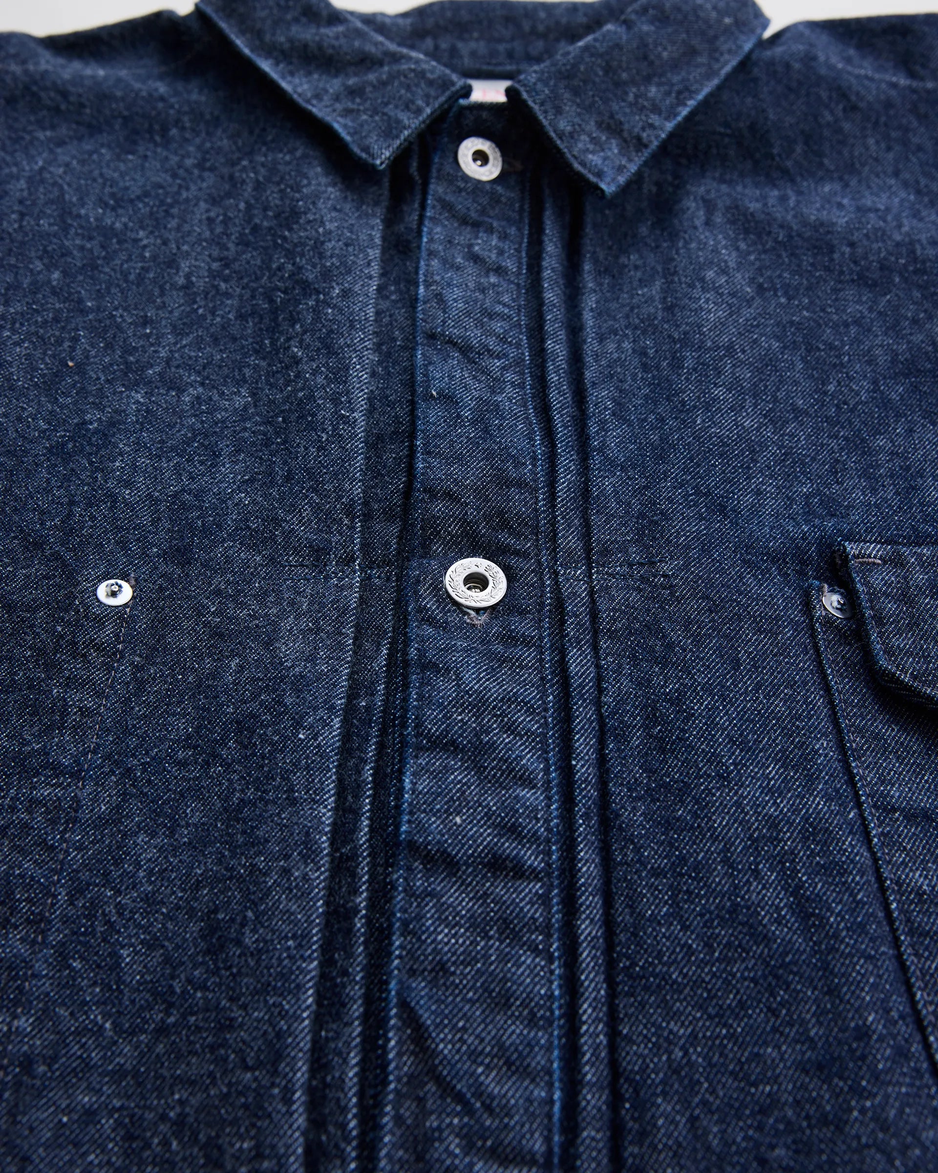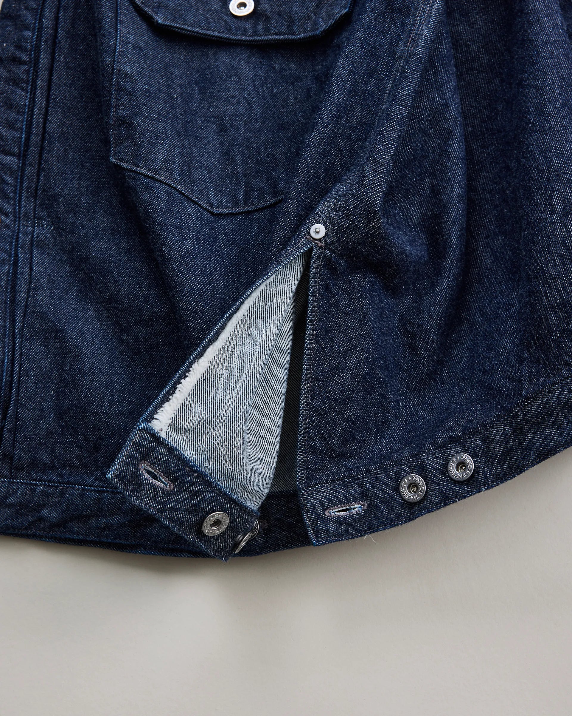 13ozの右綾で織り上げたロープ染色ピュアインディゴの生機(きばた)デニム生地で製作したトラッカージャケット。1930年代〜40年代のデニムブルゾンをリファレンスとし、日本の着物に通じる直線的なパターン構成を取り入れ袖山の丸みを排したシルエットに再構築しています。芯白のムラ糸による豊かな表情と、加工を施していない生機特有の毛羽立ちや硬質な風合いが、経年とともに育つヴィンテージライクな佇まいを実現。過去と現在、洋と和という相反する美意識を内包し時間と共に深化する一着です。