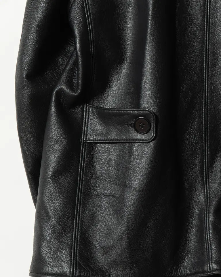 1930 年代のアメリカ製カーコートをベースにしたレザージャケット。フロントはフラップのない両玉縁仕様のハンドポケットのみのシンプルなデザイン。袖口にはクラシカルな形状のカフスが付いており、バックスタイルは車のシートを傷つけることがないよう金具を使用しないウエスト調整用のタブがついている。数あるヴィンテージピースの中でも、前身頃に接ぎのない一枚革仕立ては珍しく、贅沢な仕様であり、それを再現すべく鹿革の選定には吟味を重ねピット鞣しのヌメ革を使用した。ピット鞣しとは植物の樹脂タンニンが入った槽に長時間漬け込む鞣しの方法。漬け込む期間だけで約1 カ月を要する、時間と手間をかけて仕上げる製法の一つで、日本では数社しかおこなっていない。鹿革は軽く柔軟性に富み、使い込むことによって、体にしなやかに馴染むのが特徴である。