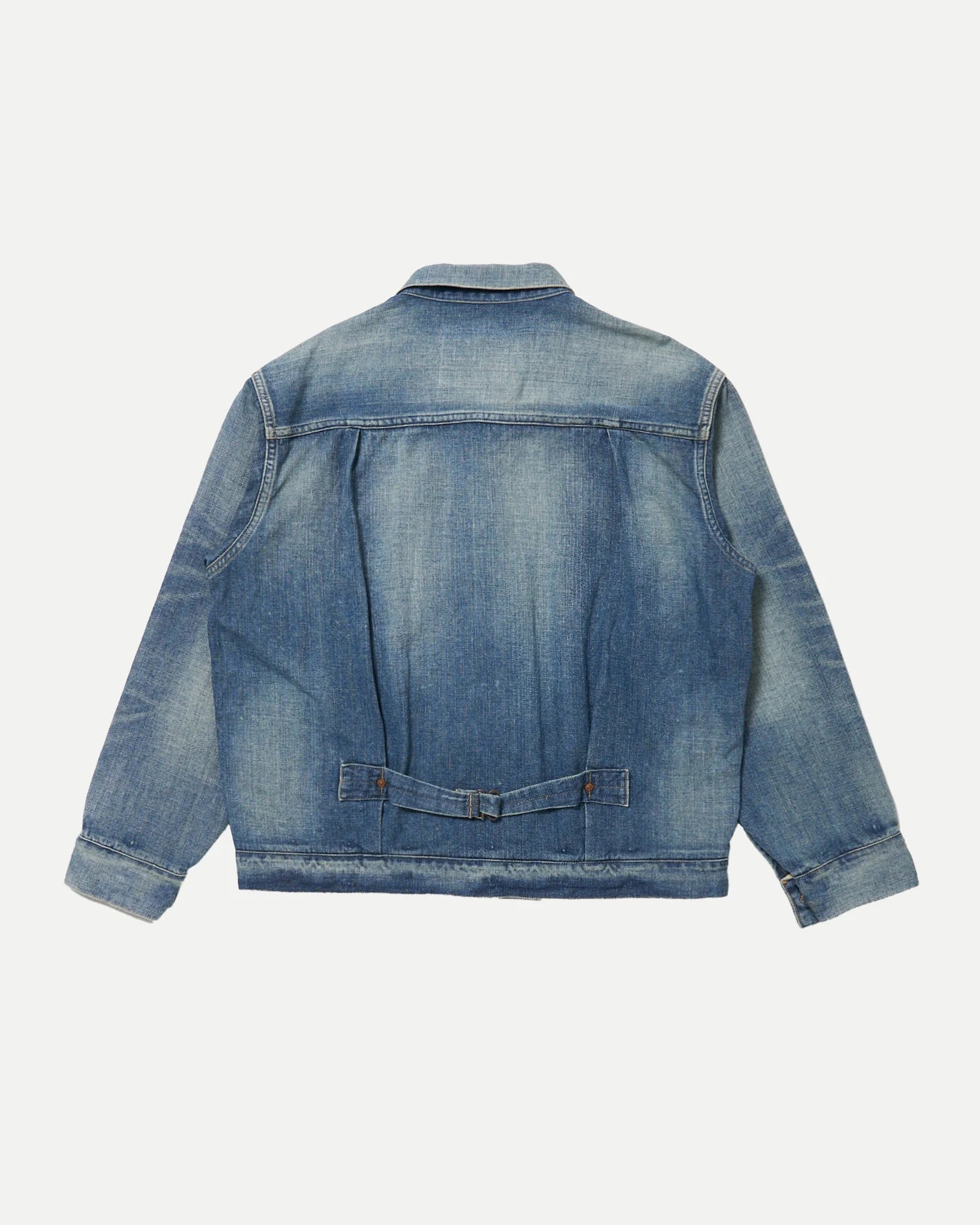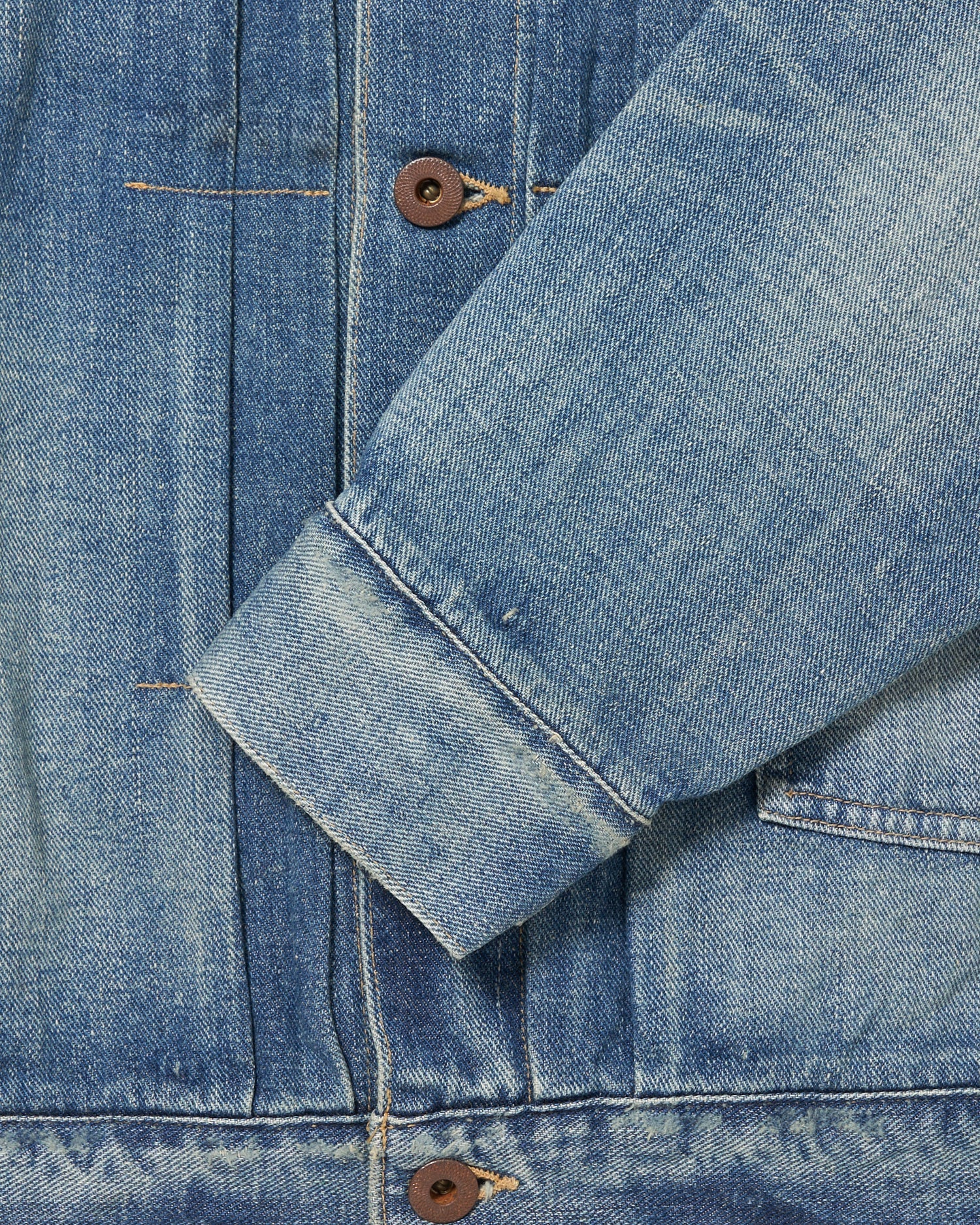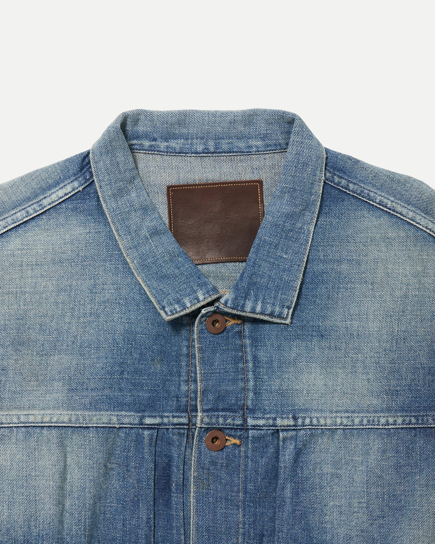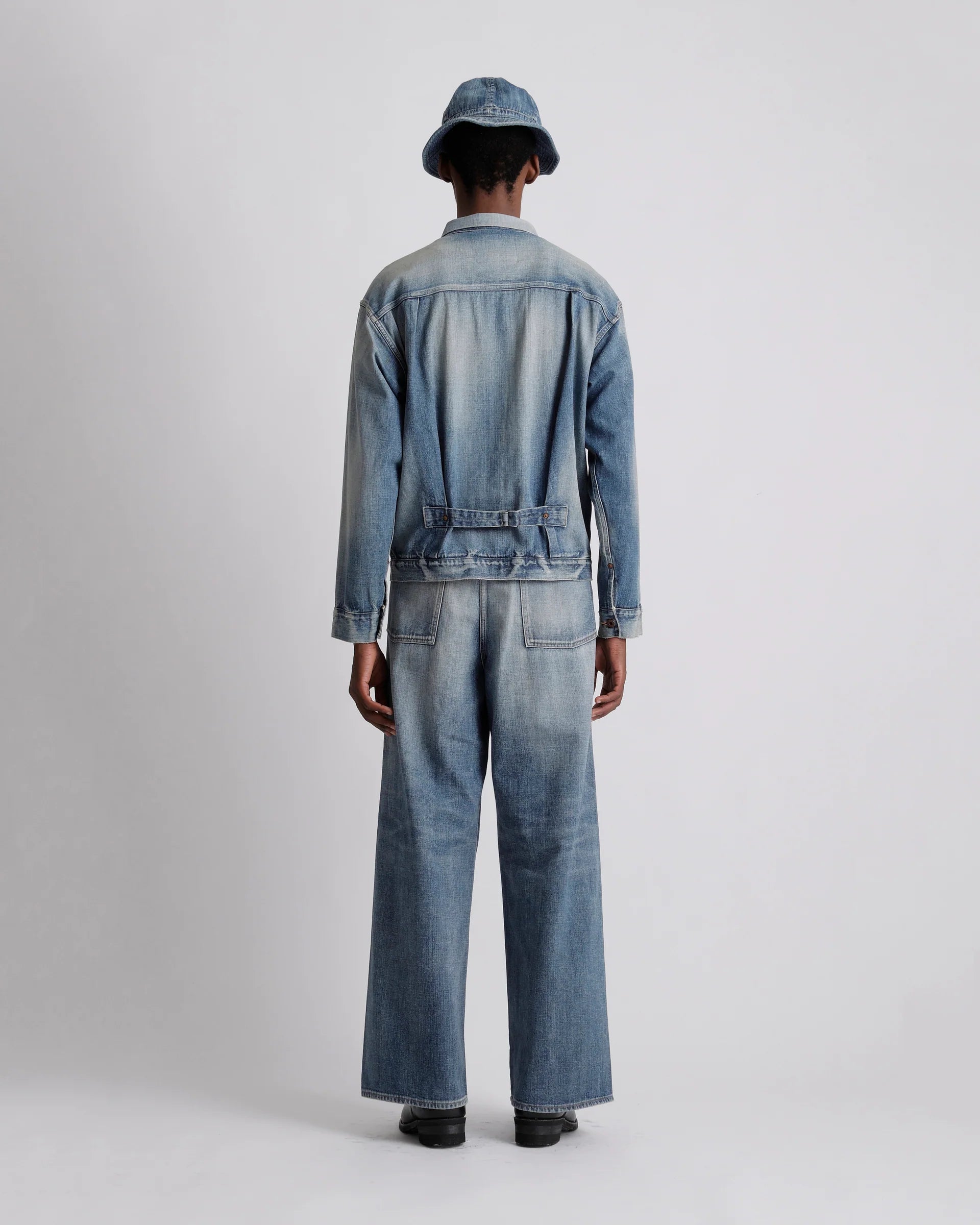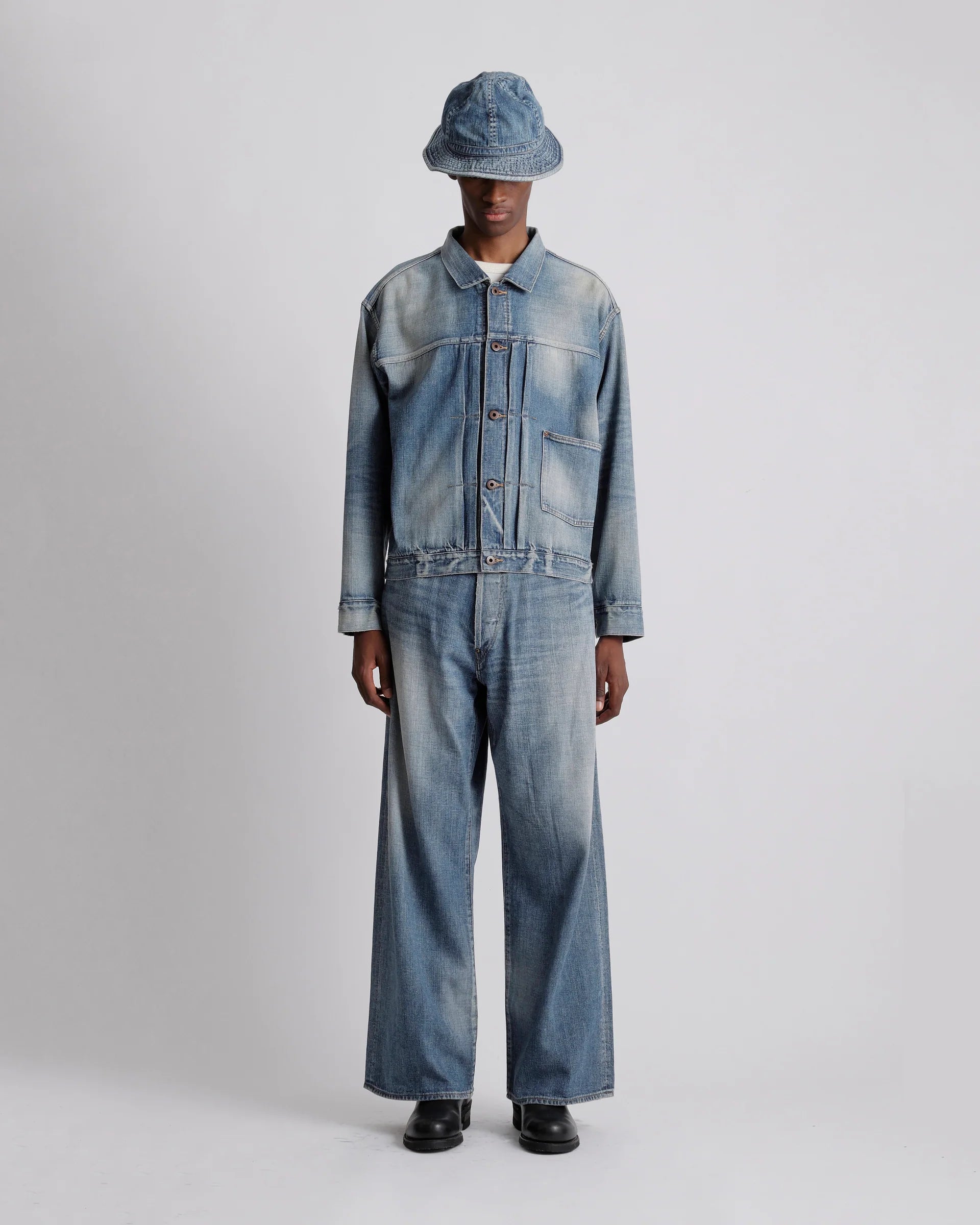 The denim jacket is based on Taiga Takahashi's iconic LOT.703 Denim Jacket c.1920's, added with distressed finish. Salt-shrink process is used in addition to the standard distressed finish to create worn-out details like wrinkles and whiskers, which make it look as if it was worn from a raw denim state. The rusty and weathered buttons, rivets, and buckles establish a distinctive presence.