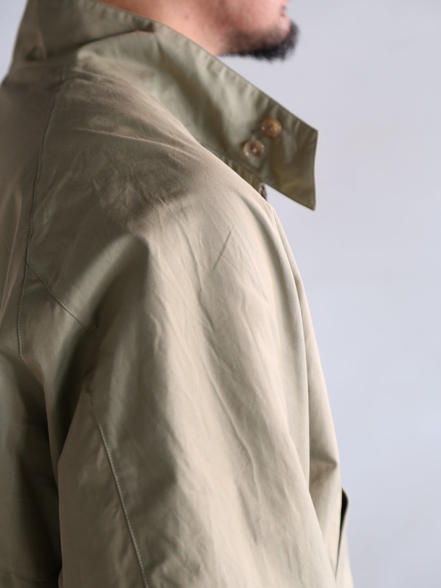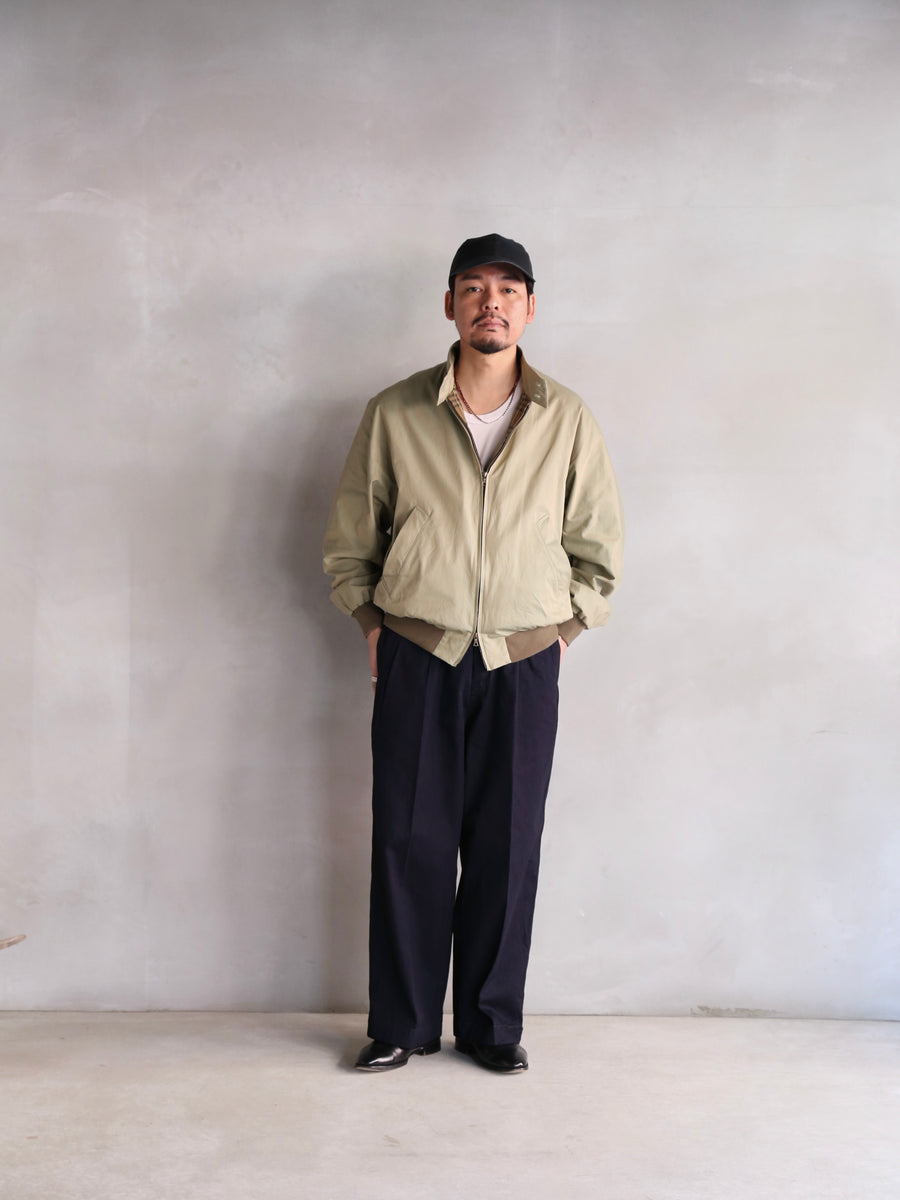 細番手の先染めコットンギャバジンを使用し、わずかにグリーンがかった玉虫調の表情が出るように織り上げています。製品洗いを施すことで、自然なシワ感や毛羽立ちを引き出し、古着のような風合いに仕上げました。生地本来の表情を活かすため、あえて撥水加工は施していません。デザインはクラシックなハリントンジャケットをベースに、裏地にはオリジナルチェックを採用。
