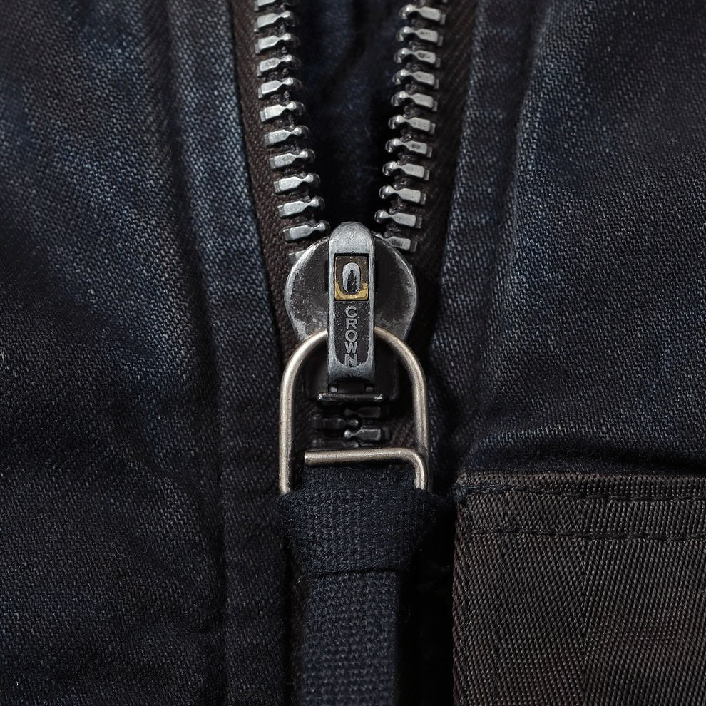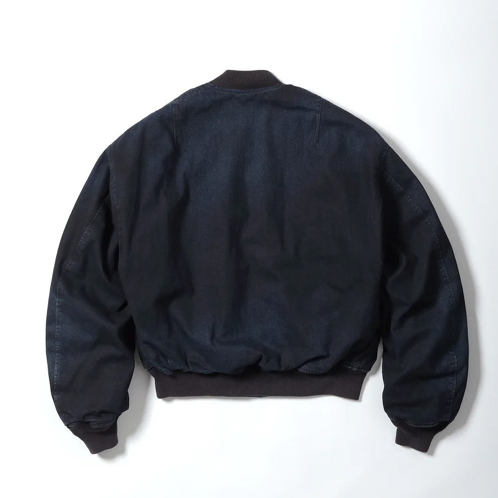 インディゴデニムの上に黒顔料を吹き付け、擦りを入れることによりインディゴとブラックの深みのある色合いが魅力のMA-1。ファスナーはCROWNファスナーを採用。アルミ合金のスライダーとなっており、エレメント部分は一般的なプレス式ではなく高圧鋳造法を用いて滑りやすくした。中綿には現アメリカ軍で使用されている米国製の高機能綿であるCLIMASHIELD(クライマシールド)を用いることで軽量かつ保温性や防湿性、形状保持に優れた内容に。