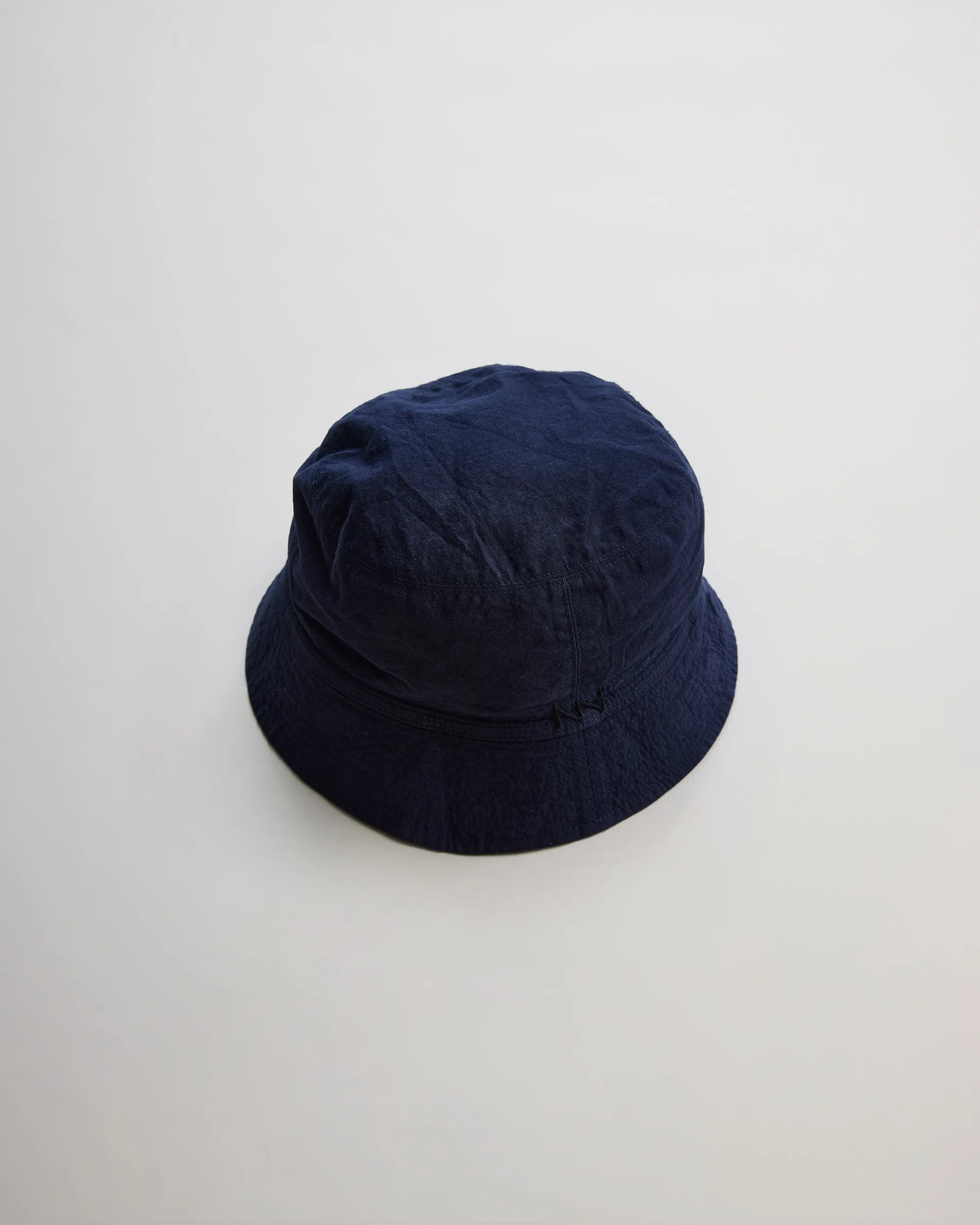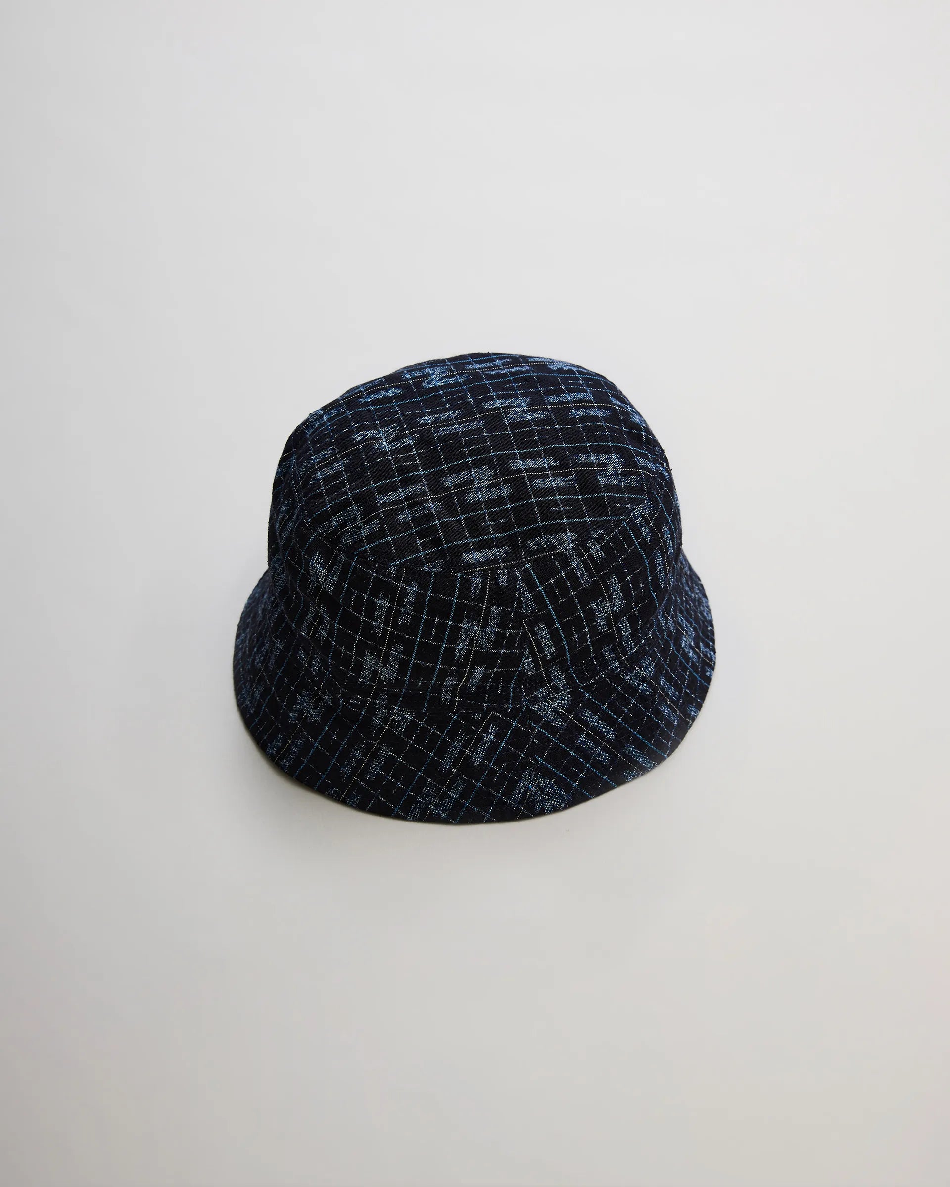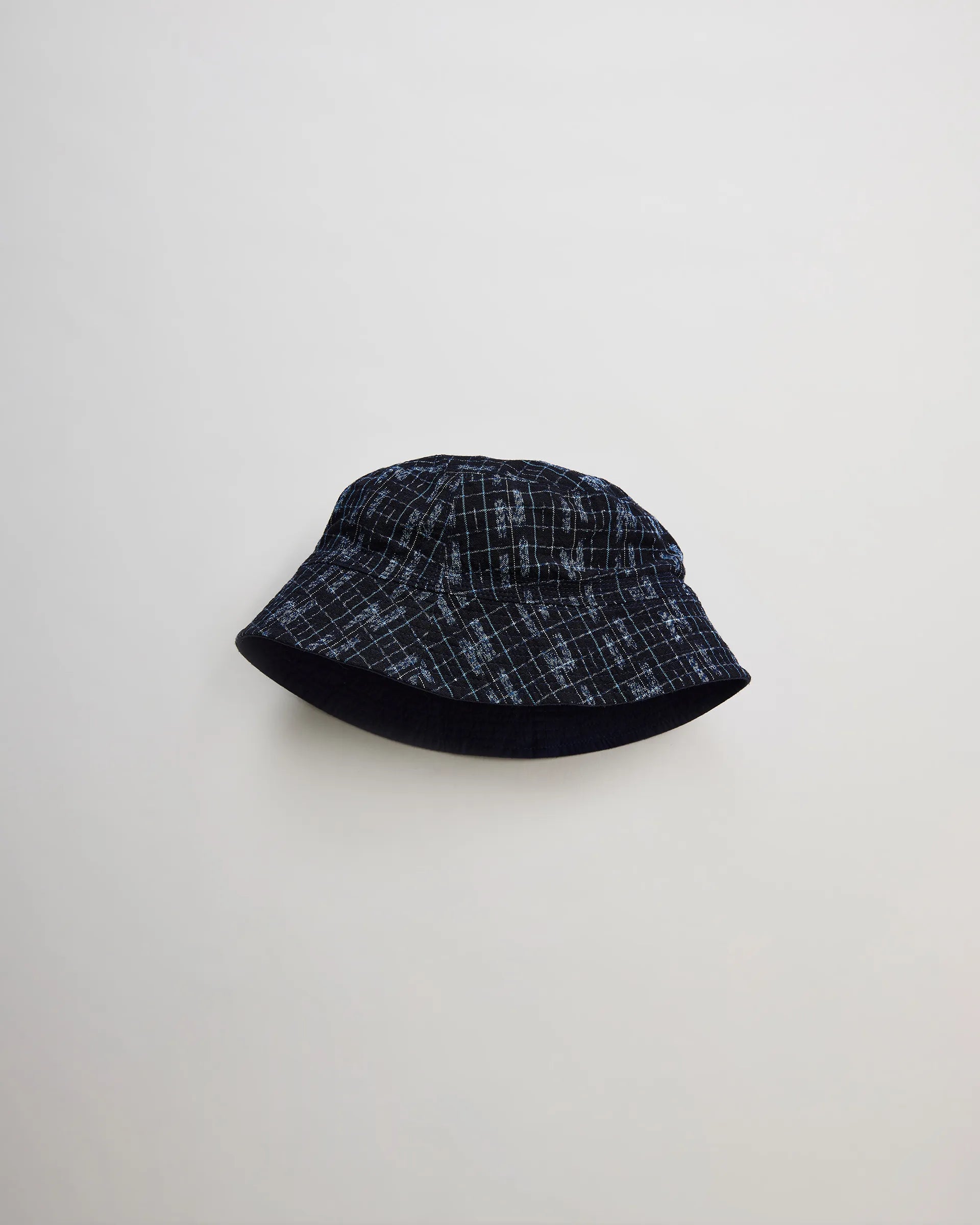 久留米絣とアンティークバーバリー生地で製作したサンゲンリバーシブルハット。型はフランスのバケットハットとアメリカのセーラーハットをリファレンスにコンパクトなシルエット。生地はタテ糸・ヨコ糸の一部を防染して織り上げる伝統的な手法を活かした久留米絣で、細番手の使用により繊細で品のある柄表現をしています。裏地のアンティークバーバリー生地には東炊き加工を施し、独特の柔らかさとくったり感を実現。意図的に歪みを加えたブリムがヴィンテージの風合いを漂わせ、折りたたんでポケット収納も可能なアイテムに仕上がっています。