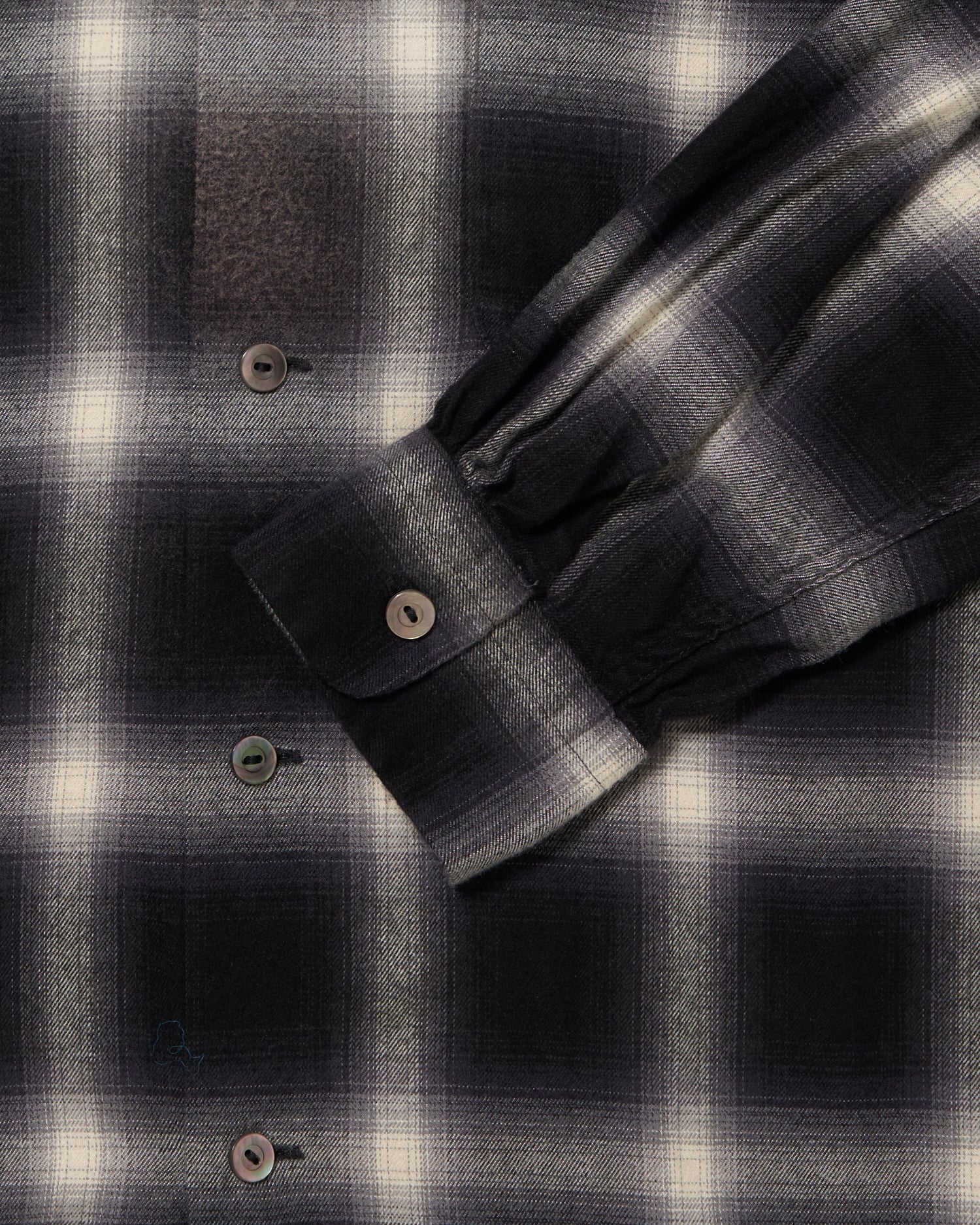 To enhance the silhouette, this item uses a drapey ombré check fabric blended with rayon. The brushed surface adds warmth to this lightweight fabric. Bleaching process was added to obtain natural fadedness of used clothes.