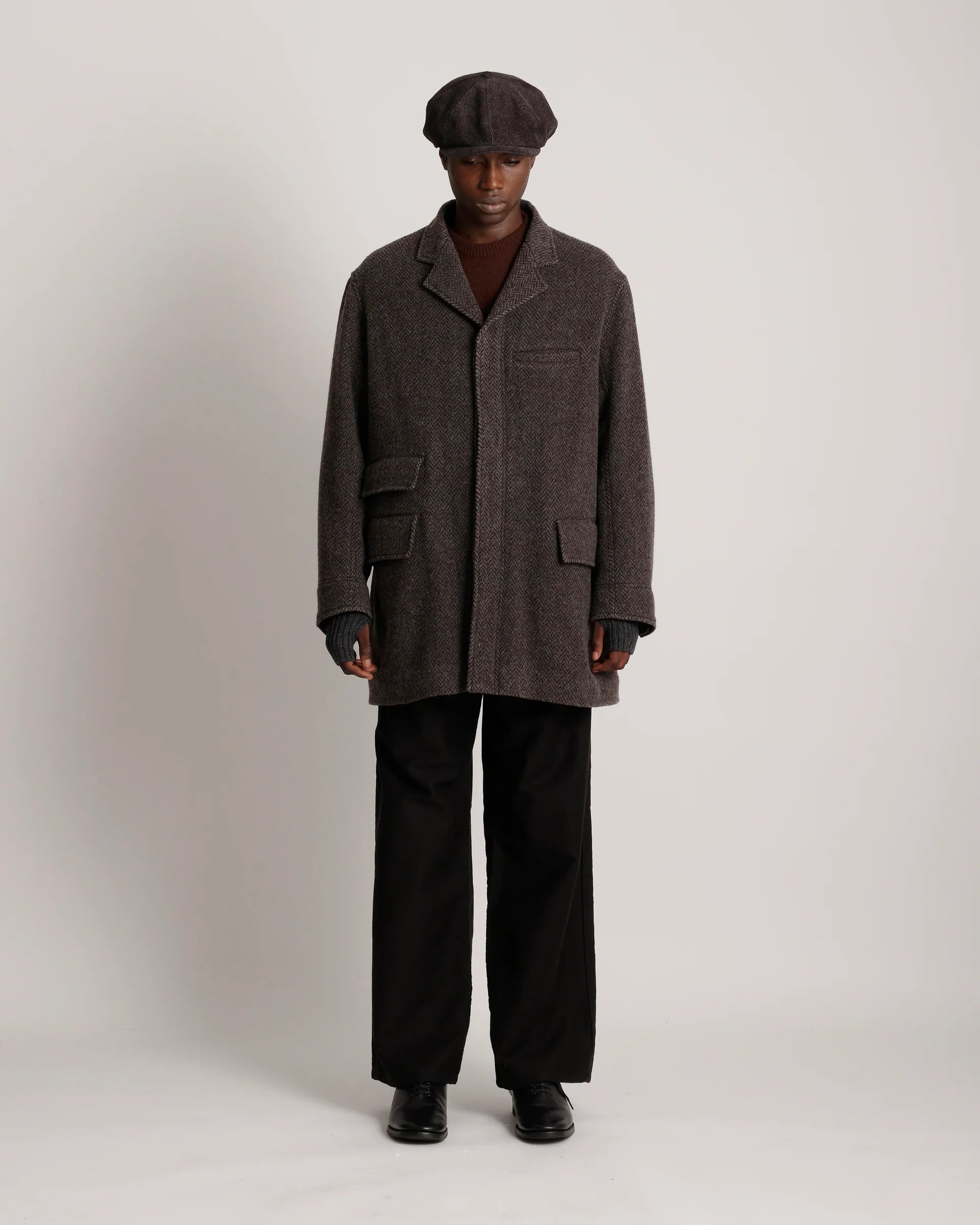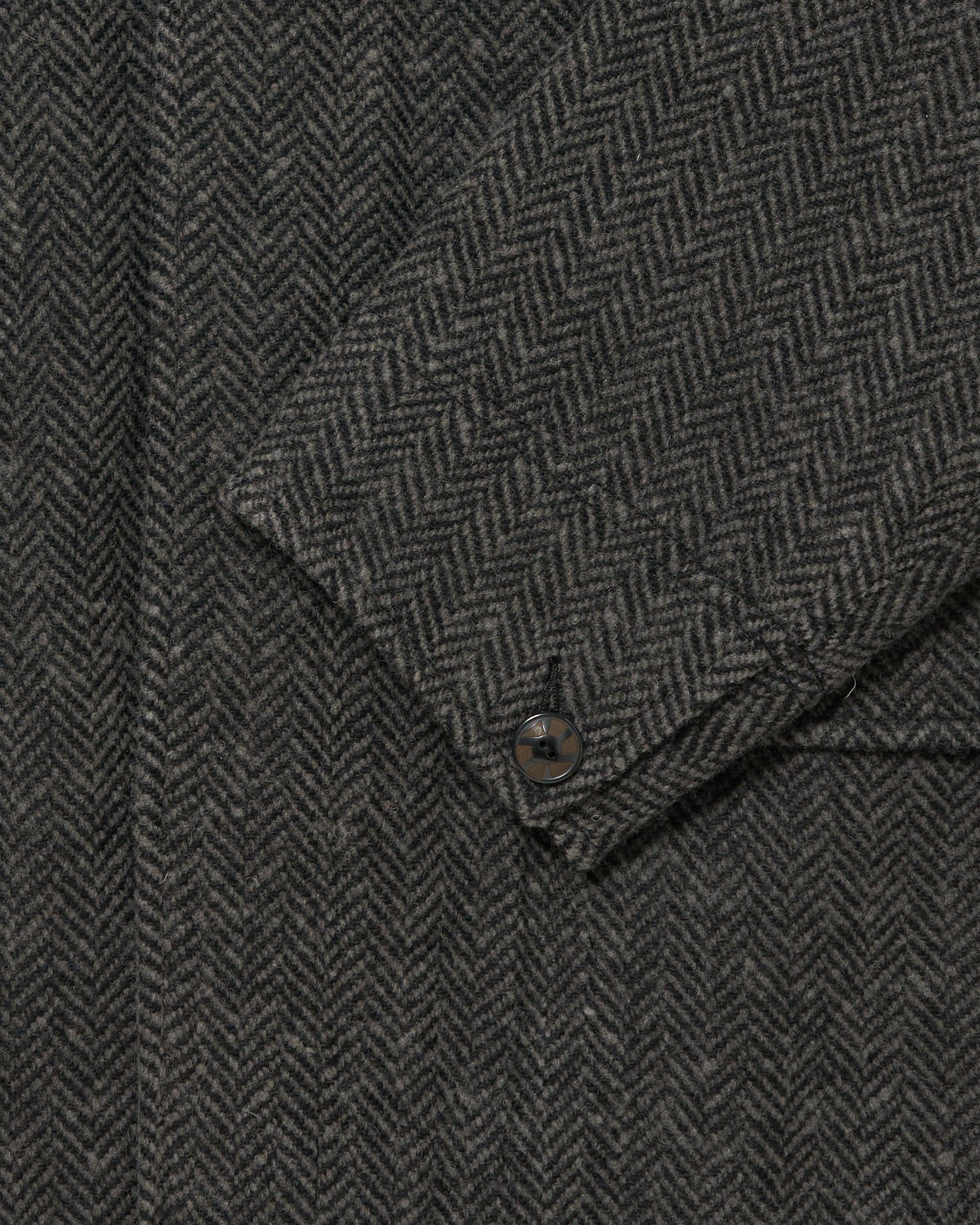 SUMI DYED BLACK uses a herringbone nep tweed dyed with sumi black ink. The herringbone pattern only manifests as subtle shades, oozing Japanese aesthetics. BLACK features tweed made from Suffolk wool. The natural springiness of the fibers keeps material airy, lightweight, and highly insulating.