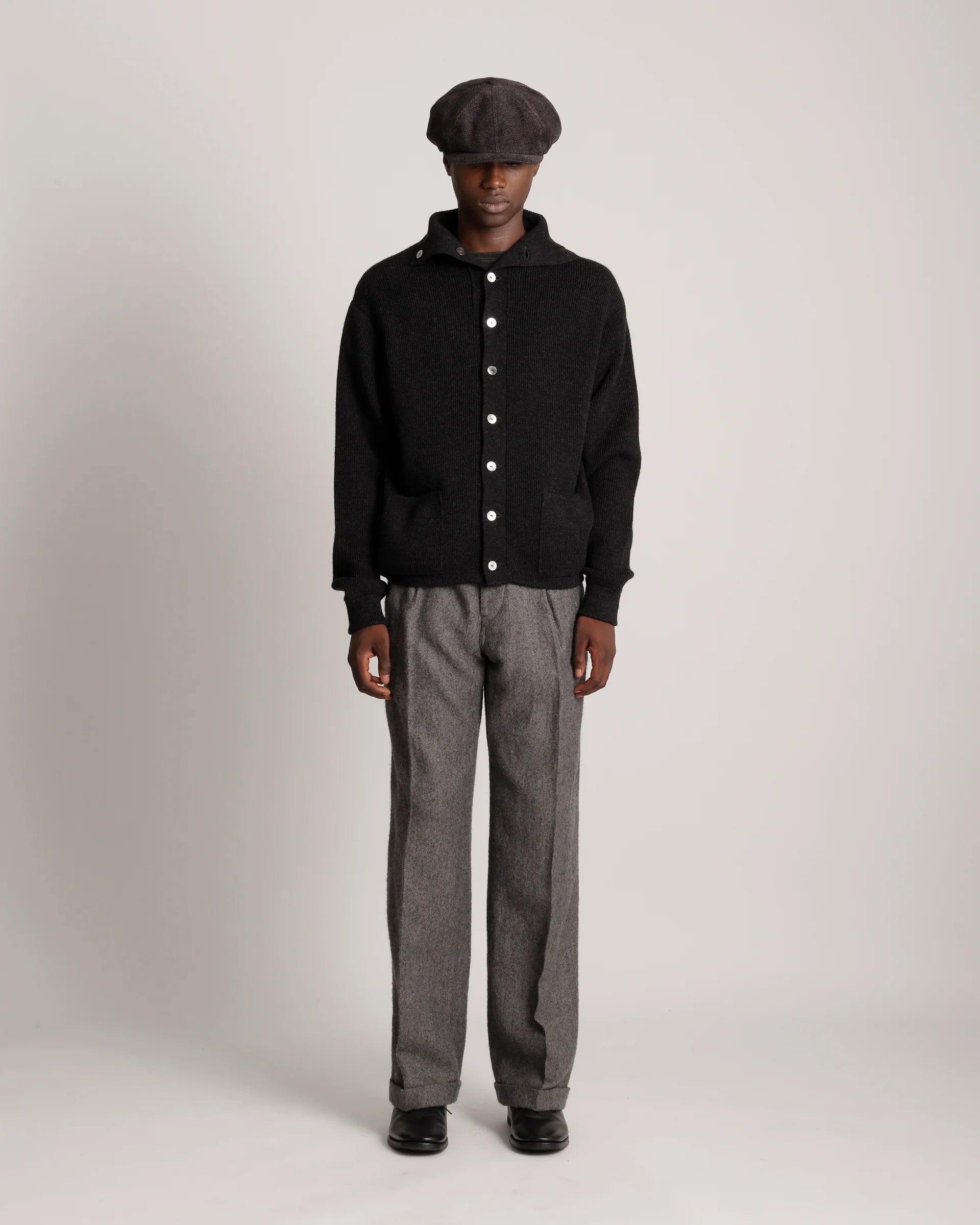 The cardigan is an inspiration from a 1960s knit cardigan by an old-established Austrian manufacturer founded in the late 19th century, which is said to have introduced knitting techniques from the UK. The cardigan showcases a tightly knitted fabric and a seamless, shaped knitting technique that extends to the neck fold-over, a feature quite advanced in earlier times.