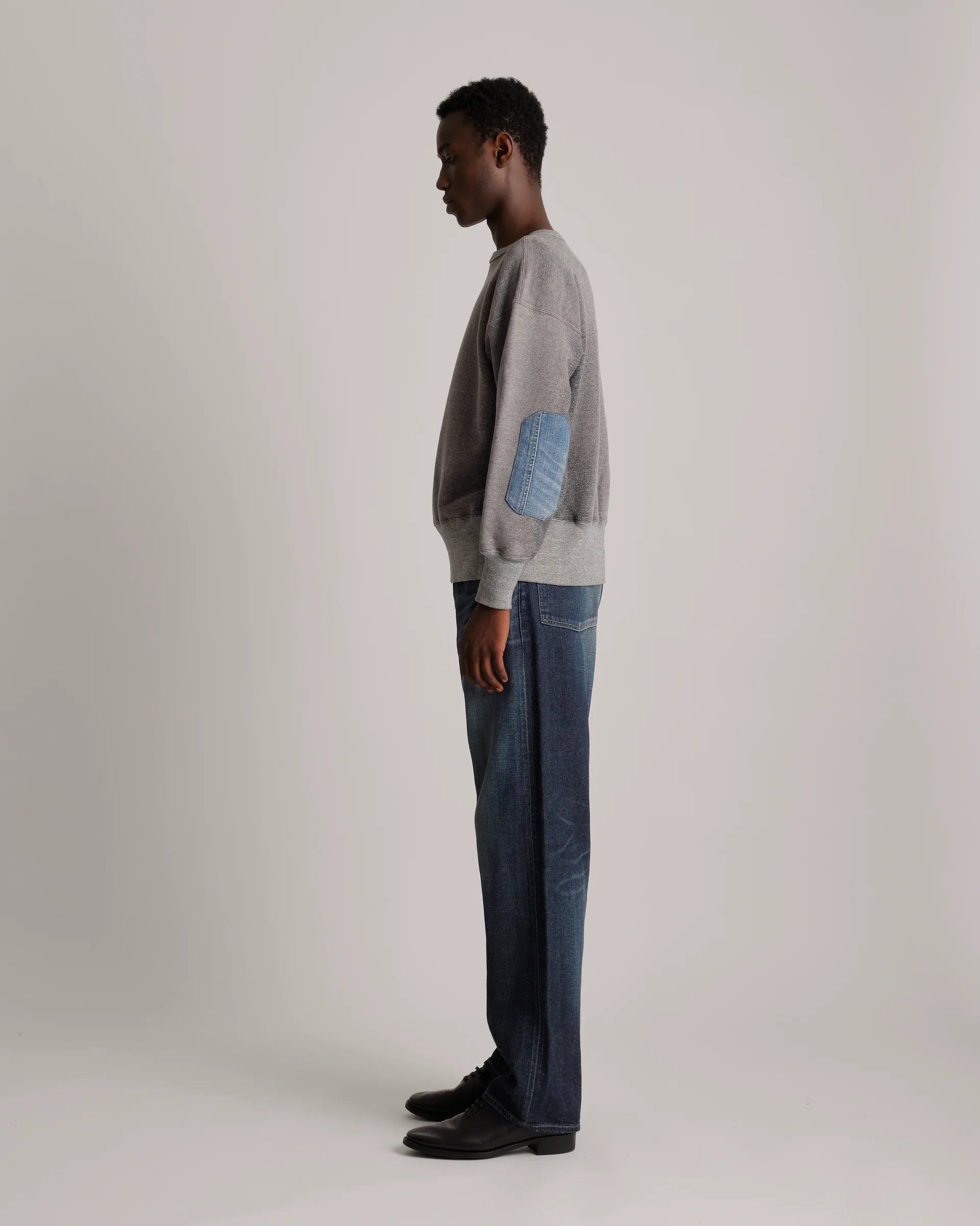 The sweatshirt takes root in the origin of American sportswear before the 1950s when synthetic materials became a mainstream. Like LOT.601 T-shirt, the item is characterized by direct cutting lines and a flat shape. Backgrounds of details forgotten in today's apparel production like V gussets, added on the front and back of the neck to stop sweat, is understood by reconstructing the process in earlier times.Elbow patch details are added to style as vintage clothing often found with repair patches.