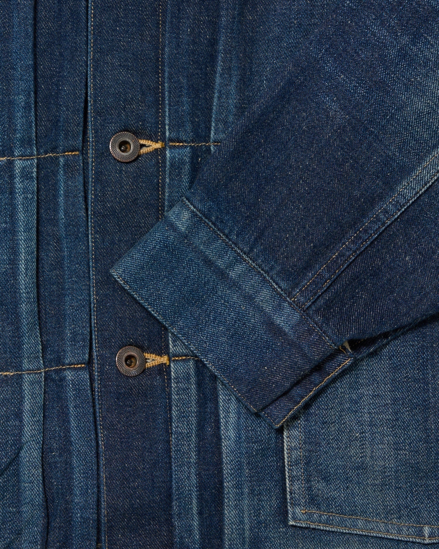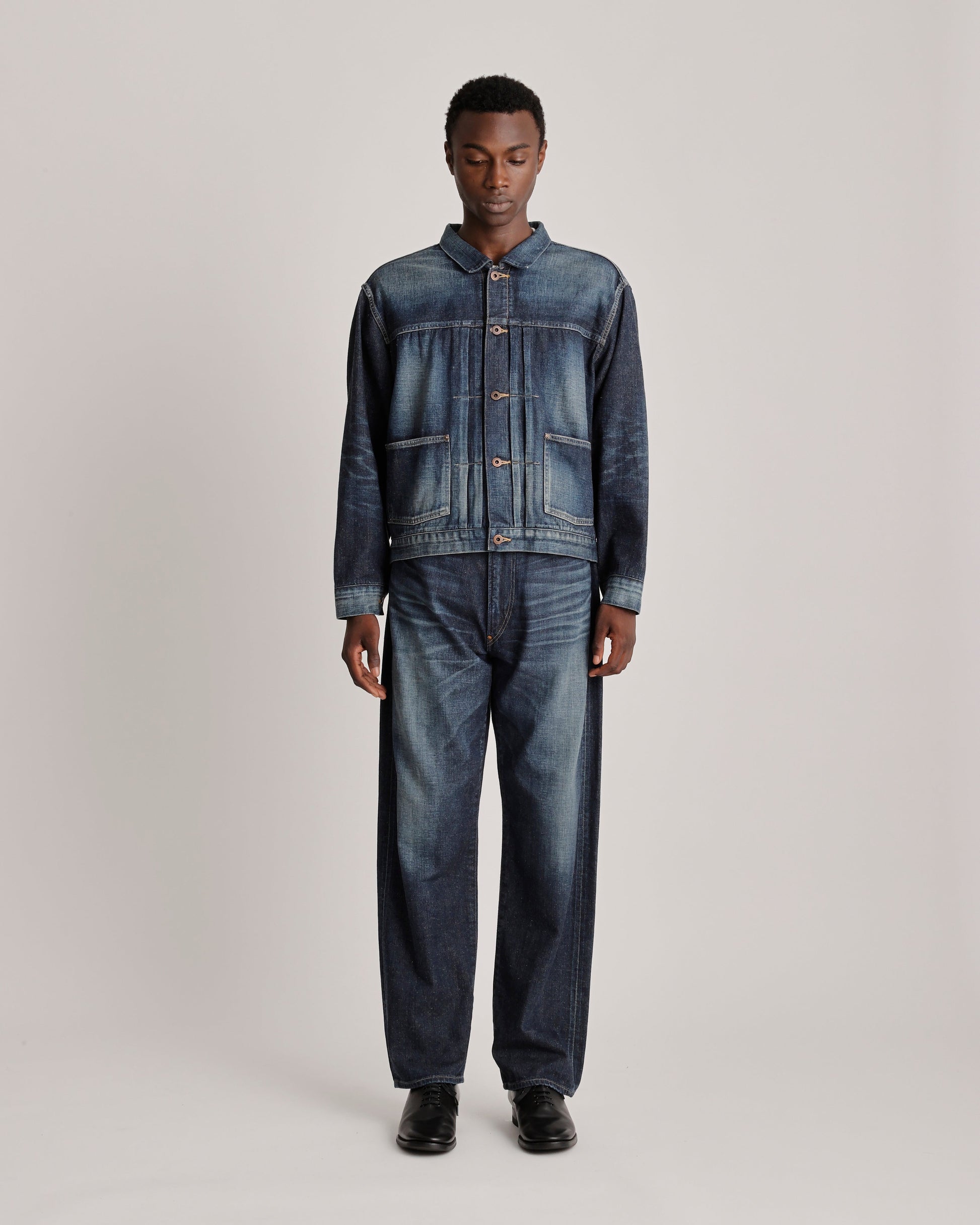 A vintage denim jacket using selvedge requires a back seam when graded to a larger size due to the limited fabric breadth. Seams change location with different ages and models, and for this design, we referred to a vintage piece modestly incorporating side seams. It suggests a relaxed t that can accommodate layered or thick innerwear.