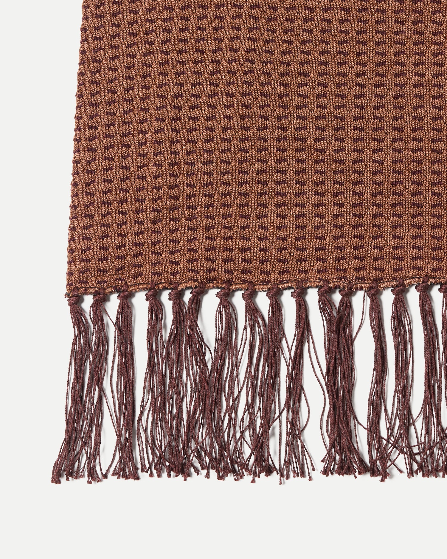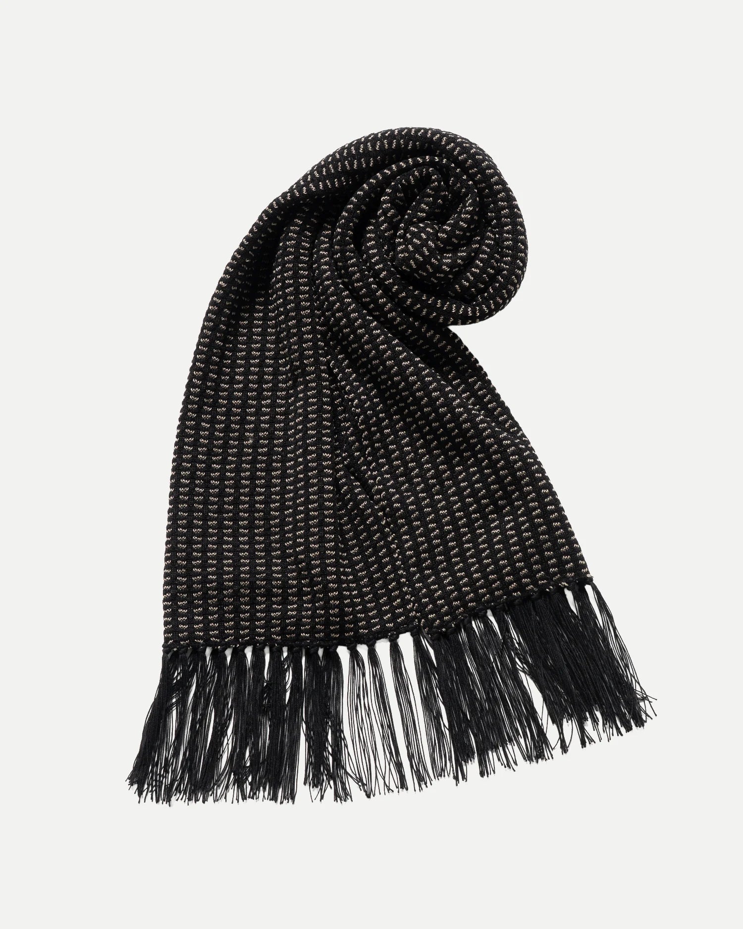 Scarves were an essential item in the styling in the old days. We designed it with a narrower width to propose a layered style under the jacket. The scarf features manually attached fringes made of original twist thread.